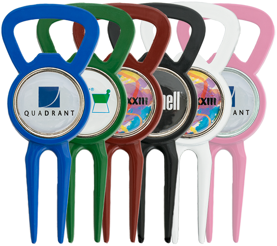 Golf divot repair multi-tool with dual prong forks. Includes polished black nickel finish with textured grip. Dual function belt clip with bottle opener. Integrated cigar holder, golf club groove cleaner and fine particle brush, perfect for cleaning clubs and golf balls. Includes 1″ removable ball marker with full color dome imprint. Fast 6 work day production. Rush service available. Hand out this prize to new and potential clients, players, sponsors, and guests at golf outings, and other golf events to spread your brand or message!